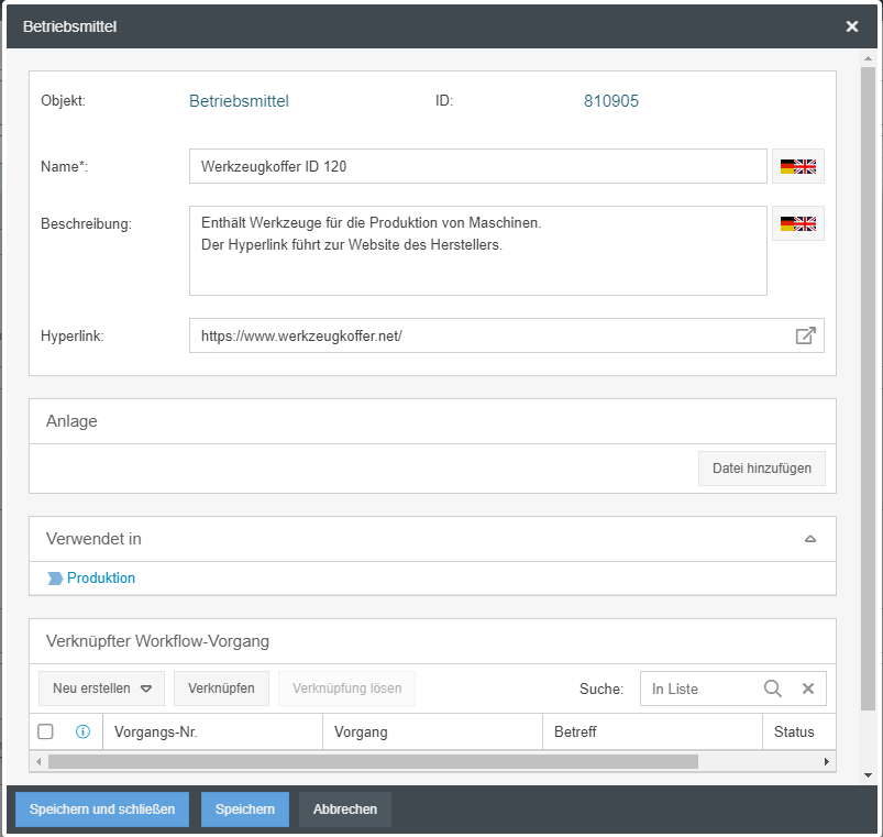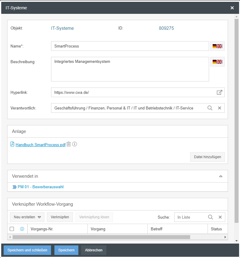 - Zu einem IT-System lässt sich auch ein Workflow-Vorgang verknüpfen. Näheres hierzu wird im Artikel zu Kennzahlen, Risiko und Chance beschrieben