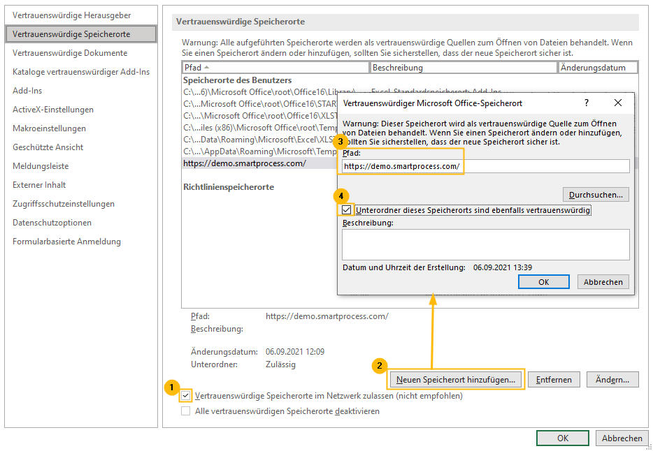 - "Unterordner dieses Speicherorts sind ebenfalls vertrauenswürdig" muss angehakt sein. Bestätigen Sie mit <OK>.