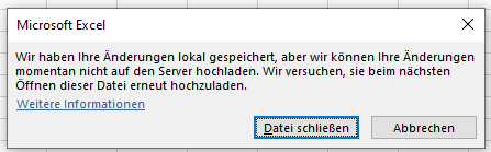 Dabei wird ein Hinweis gezeigt, dass Änderungen vorerst nur lokal gespeichert werden und/oder, dass es einen Fehler beim Upload gab.