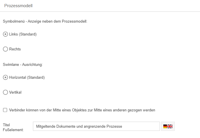 Alle Einstellungen wirken sich global für alle Benutzer des gesamten Systems aus. Prozessmodell. Anzeige des Symbolmenüs. Hier wird eingestellt, ob der Symbolbereich im Prozessdesigner links oder rec…