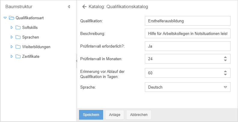 Alle möglichen Fähigkeiten werden zentral im Qualifikationskatalog im Menü Kataloge erfasst, um sie später Rollen oder Benutzern zuzuordnen. Die Erstellung und Verwaltung von Qualifikationen erfolgt genauso, wie im Artikel Katalogdaten verwalten beschrieben.