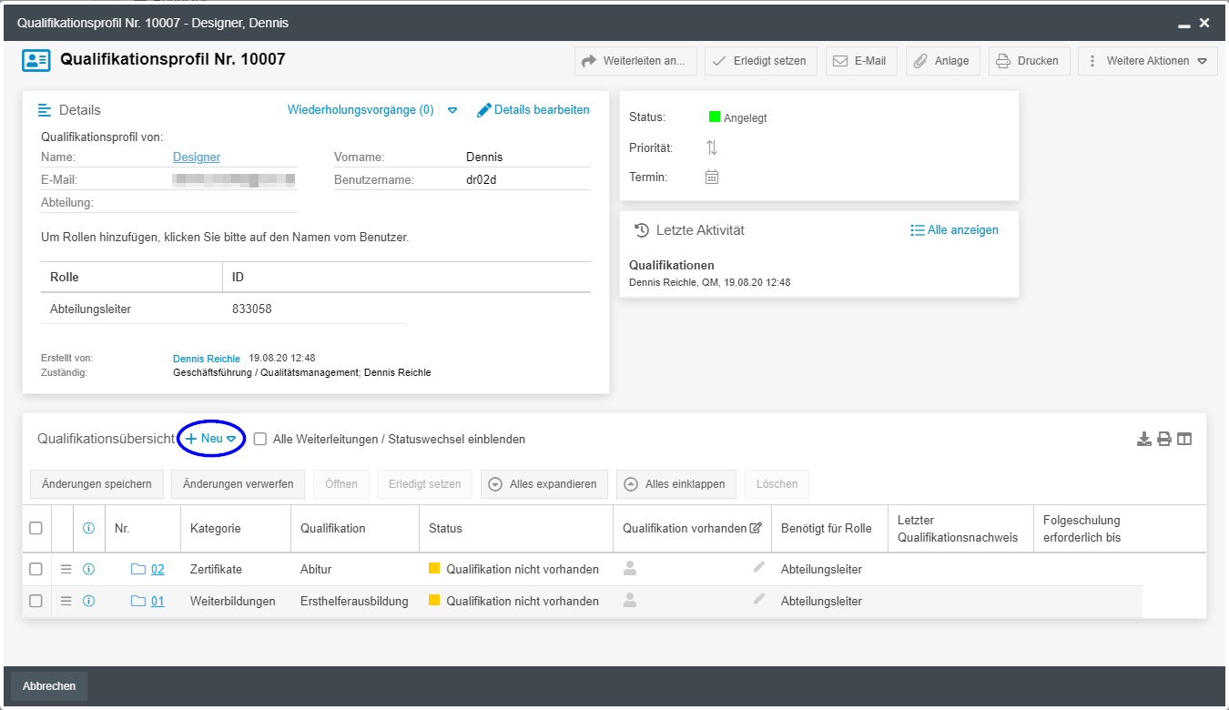 Da es sich beim Qualifikationsprofil eines jeden Benutzers um einen eigenen Workflow-Vorgang handelt, erscheint wie gewohnt das Vorgangsfenster und bietet folgende Informationen und Möglichkeiten: