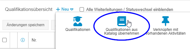 Über den Button <+ Neu> in der Aktivitätenliste können für den Benutzer aus dem Katalog beliebig viele weitere Qualifikationen in das Profil übernommen werden
