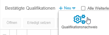 Um einen solchen Nachweis für die Qualifikation zu hinterlegen, öffnen Sie per Mausklick in die entsprechende Zeile eine der Qualifikationen. In der Aktivitätenliste der einzelnen Qualifikation kann nun über <+ Neu> ein neuer Qualifikationsnachweis hinterlegt werden.