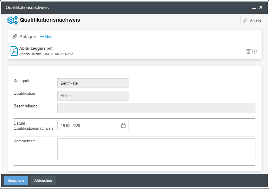 In der Aufgabe kann nun z. B. ein Zertifikat als Dateianlage per Drag & Drop eingefügt werden, das die Qualifikation für den Benutzer nachweist. Zudem dient das in diesem Fenster eingetragene Datum für die Berechnung der Gültigkeit.