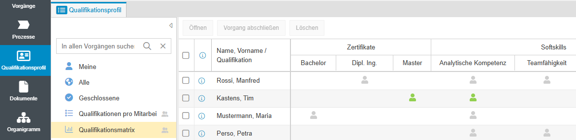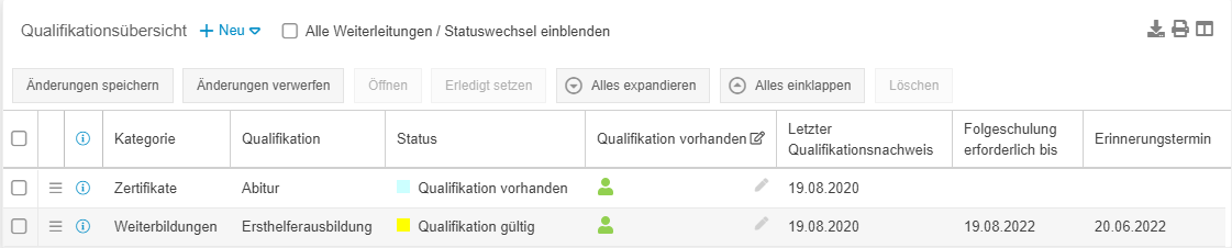 - In der Aktivitätenliste werden Qualifikationen des Mitarbeiters aufgelistet. Anhand des Status der Qualifikation kann beurteilt werden, ob diese noch erworben werden soll oder aktuell vorhanden ist.