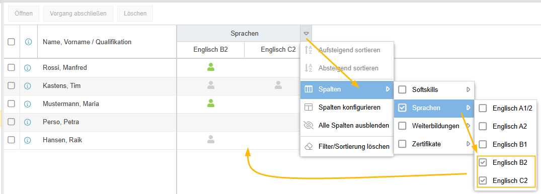 Das folgende Anschauungsbeispiel zeigt die Konfiguration und Ergebnisansicht einer Kreuztabelle, um einen Mitarbeiter mit Englischkenntnissen von mindestens B2 herauszufiltern, der als Dozent für einen englischsprachigen Vortrag eingesetzt werden kann.