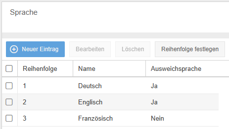 Im Menüpunkt Sprache können Sie die verschiedenen im System genutzten Sprachen verwalten. Diese Sprachen stehen allen Anwendern nach der Anmeldung zur Auswahl. Welche Sprache bei der Erstanmeldung un…