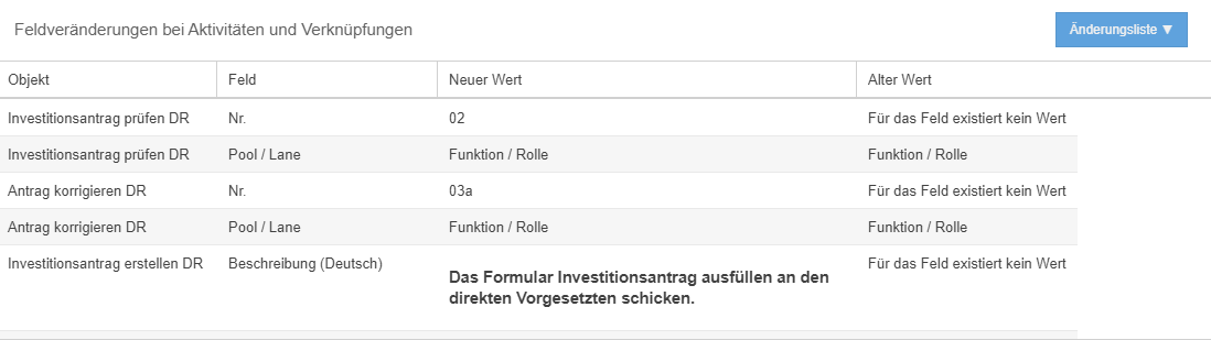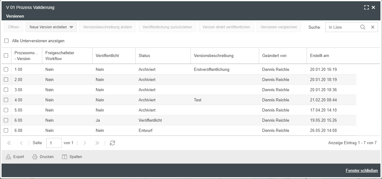 Hier wird aufgelistet, welcher Benutzer welche Version des Prozesses zu welchem Zeitpunkt erstellt hat. Dabei sind folgende Status der Versionen möglich: