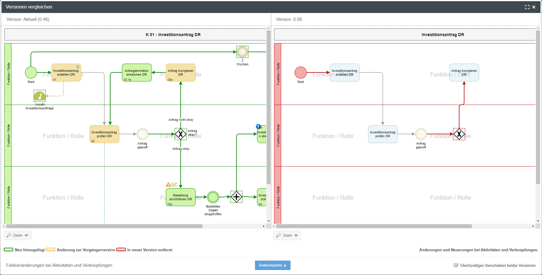 Sobald im Fenster per Checkbox genau 2 Versionen ausgewählt wurden, lässt sich der Button <Versionen vergleichen> anklicken. In einem neuen Fenster werden die Prozessmodelle der beiden Versionen gegenübergestellt, wobei die neuere Version links dargestellt wird. Änderungen werden grafisch folgendermaßen hervorgehoben: