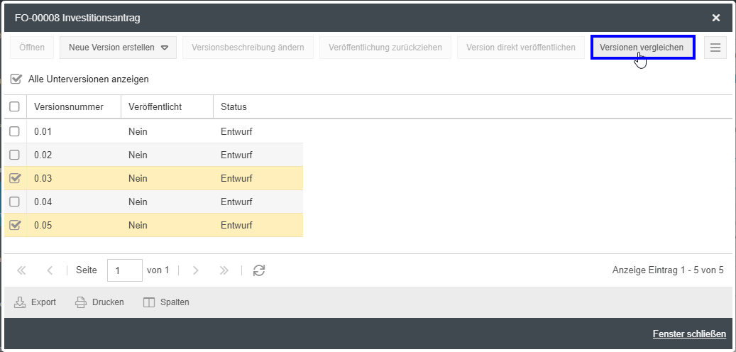 - Entwurf -> Dieser Versionsstand war nie veröffentlicht und kann nur von Benutzern mit Designer-Lizenz und Bearbeitungsrechten für den Prozess über das Fenster Versionen eingesehen werden.