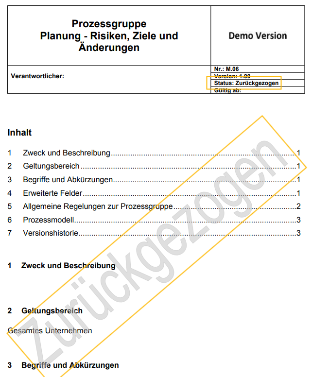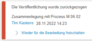 ![]() Zurückgezogen | Eine veröffentlichte Version des Prozesses wurde zurückgezogen. Nur Benutzer mit Bearbeitungsrechten für den Prozess können diesen noch sehen. Die Bearbeitung ist erst nach einer Freischaltung wieder möglich (siehe Abschnitt unten). |