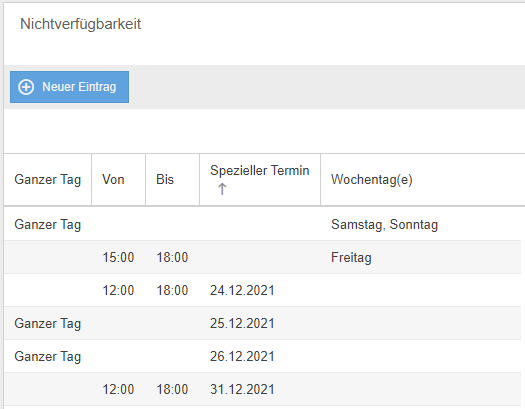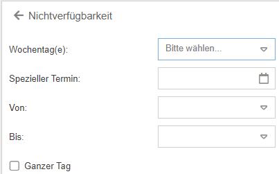 Sie haben die Möglichkeit Wochentage als Nichtverfügbarkeit einzutragen oder spezielle Termine (z. B. Neujahr, Ostermontag etc.). Um die Nichtverfügbarkeit genauer zu spezifizieren, können Sie angeben, ob die Nichtverfügbarkeit ganztägig ist oder nur einen Teil des Tages umfasst.