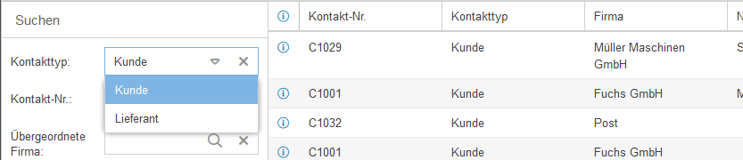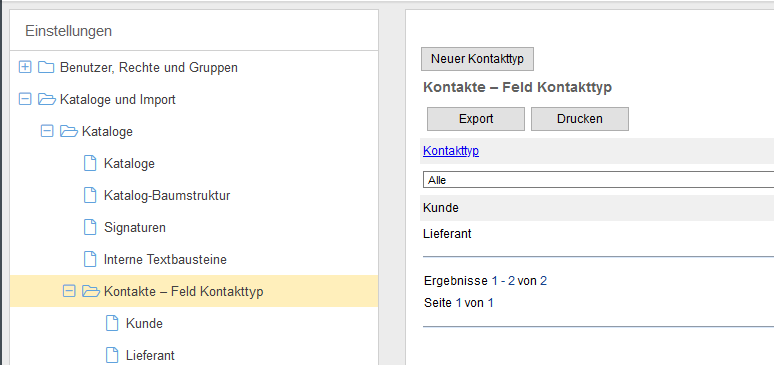 Für das Menü Kontakte und dort für die Verwaltung von Kontakten können Sie hier das Auswahlfeld Kontakttyp verwalten. Sie können hier die Auswahl der Checkbox definieren. Die Auswahl des Feldes Konta…