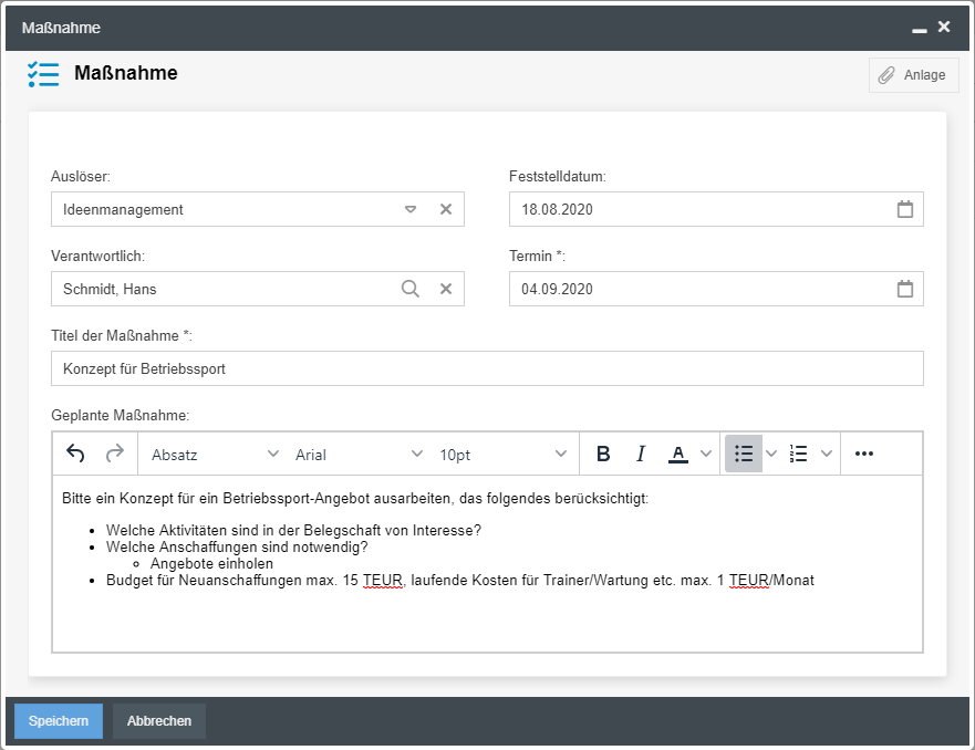 Die weiteren Felder eignen sich bei späteren Auswertungen zur Filterung (Auslöser) oder dienen zur Beschreibung der durchzuführenden Aufgaben für den Verantwortlichen (Titel & Geplante Maßnahme).