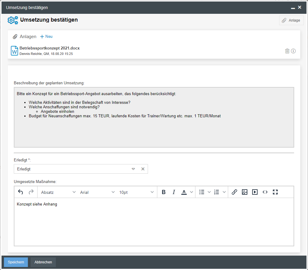 Neben der Auswahl, dass die Aufgabe erledigt wurde kann die Umsetzung in einem Kommentar weiterführend beschrieben und bei Bedarf Dateianlagen per Drag & Drop in der Eingabemaske hinzugefügt werden. Anschließend wird der Vorgang per Klick an den Ersteller der Maßnahme zurückgeleitet.