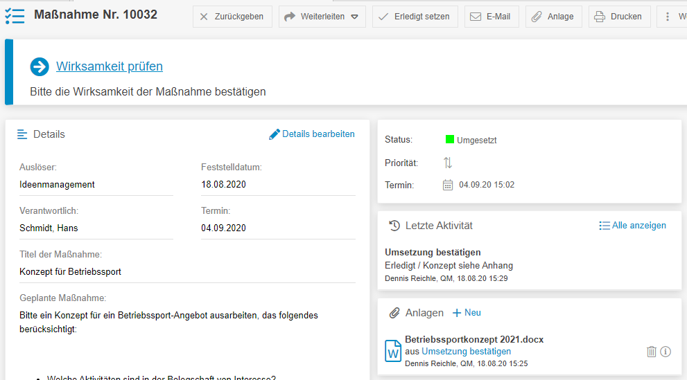 Über die Aufgabe "Wirksamkeit prüfen" kann der Ersteller nun über den weiteren Ablauf der Maßnahme entscheiden: