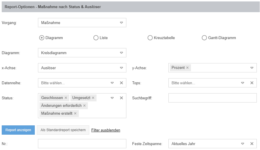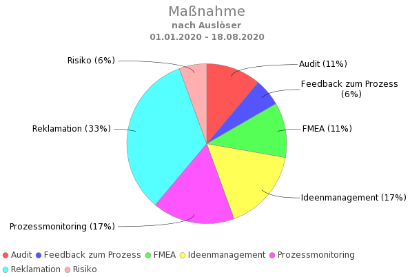 Das folgende Anschauungsbeispiel zeigt die Konfiguration und Ergebnisansicht eines Kreisdiagramms, bei dem alle Maßnahmen, die in dem aktuellen Jahr erstellt wurden, anteilig nach dem Auslöser kategorisiert werden. Daraus kann abgeleitet werden, durch welche Aktivitäten im Unternehmen viele zu erledigende Aufgaben anfallen.