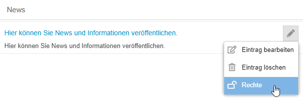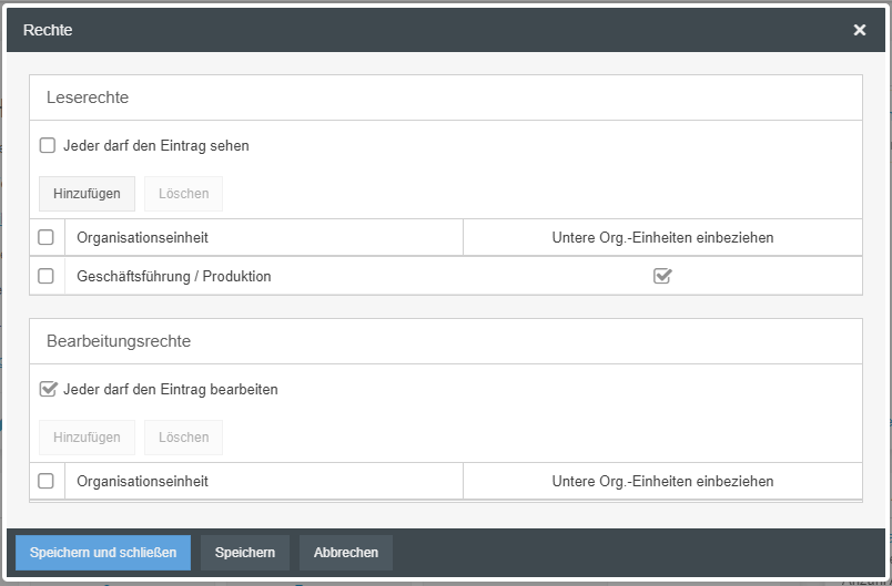 News | Das Fenster zeigt die aktuellen News an. Mit der entsprechenden Berechtigung können Sie HTML-formatierte Newstexte erstellen, bearbeiten und Ihnen nach der Erstellung Dateianlagen hinzufügen. Rechte für News-EinträgeNach der Erstellung sind News-Einträge im Standard für alle Benutzer des Systems sichtbar. Über den Bearbeitungsbutton können nachträglich pro Eintrag Lese- und Bearbeitungsrechte eingeschränkt werden, sodass nur Benutzer, die ausgewählten Org.-Einheiten zugeordnet sind, den Eintrag sehen bzw. bearbeiten können. ![]() Die Auswahl der Checkbox Untere Org.-Einheiten einbeziehen bewirkt, dass im Beispiel auch Benutzer aus Org.-Einheiten, die im Organigramm unterhalb von der Produktion angesiedelt sind, den Eintrag sehen dürfen. Die Auswahl Jeder darf den Eintrag bearbeiten bedeutet, dass jeder Benutzer mit der generellen Berechtigung zur Erstellung und Bearbeitung von News-Einträgen, auch diesen Eintrag bearbeiten darf. Dabei hat ein Benutzer mit Bearbeitungsrechten für einen Eintrag auch automatisch Leserechte für diesen, auch wenn seine Org.-Einheit nicht explizit unter 'Leserechte' eingetragen wird. ![]() |