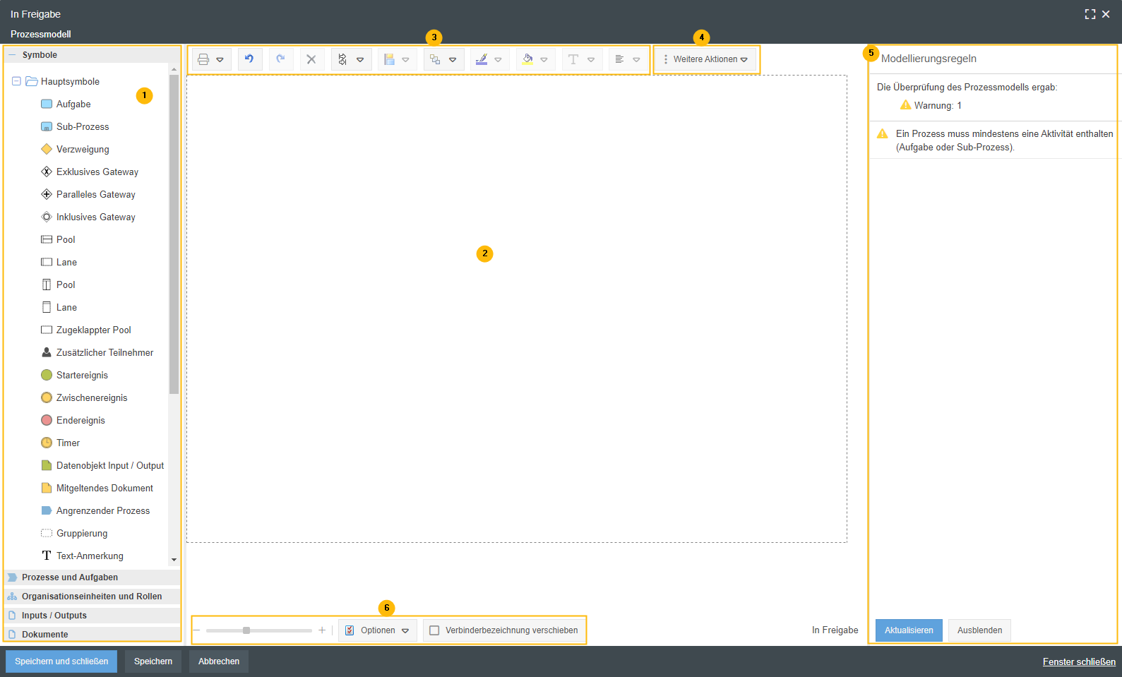 Im Arbeitsbereich wird das Modell des Prozesses oder der Prozessgruppe modelliert.