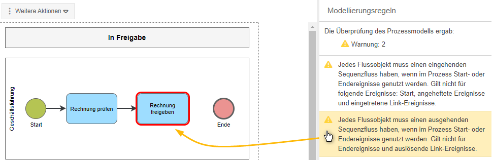 Wenn die Überprüfung der Modellierungsregeln in den Weiteren Aktionen (4) gestartet wird oder beim Speichern, falls dies in den Einstellungen festgelegt wurde, werden auf der rechten Seite die Regeln angezeigt, die durch das Modell verletzt werden. Bei mehrfachem Bruch derselben Regel wird diese auch mehrfach gelistet. Durch einfaches Anklicken der Regeln wird die entsprechende Stelle im Prozessmodell hervorgehoben: