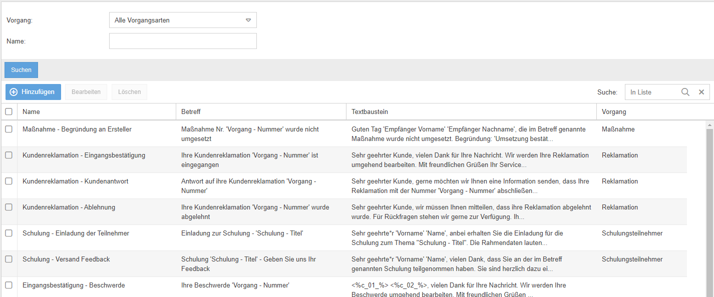 Über die beiden Felder Vorgang und Name kann nach Textbausteinen gesucht bzw, gefiltert werden. Über den Button <Suchen> kann die Suche ausgeführt werden.