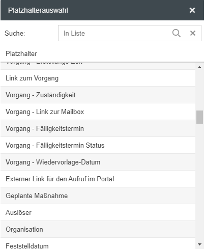 ![]() | Über das Plus-Symbol wird die Liste der verfügbaren Platzhalter geöffnet. ![]() Haben Sie den gewünschten Platzhalter gefunden, fügen Sie ihn durch einen einfachen Klick an der Stelle ein, an der der Cursor zuvor platziert wurde. Über die Suche kann ein Platzhalter auch gesucht werden. |