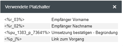 ![]() | Das Fragezeichen erlaubt es eine Liste der bereits eingefügten Platzhalter und deren Bedeutung aufzurufen. ![]() |