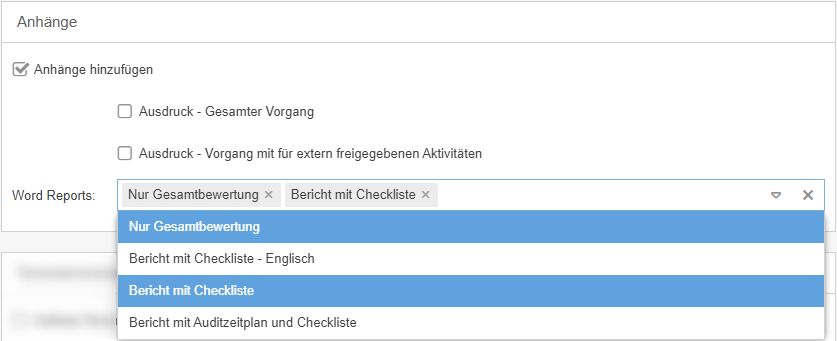 Word Reports | In dieser Auswahlliste werden die Reports aufgelistet, die mit dem Word Report Designer für Ausdrucke für den oben ausgewählten Vorgang erstellt wurden. Es handelt sich hierbei um eine Mehrfachauswahlliste, in der mehrere Einträge markiert werden können, um die Reports an die E-Mail anzufügen. |