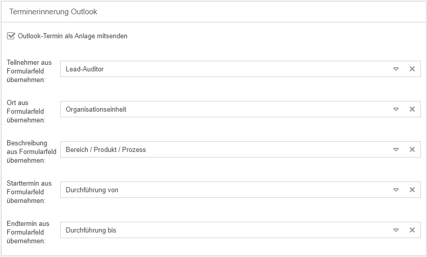 Wenn die Checkbox Outlook-Termin als Anlage mitsenden aktiviert wird, können die Details für das Mitsenden eines Outlook-Termins für einen Textbaustein definiert werden.