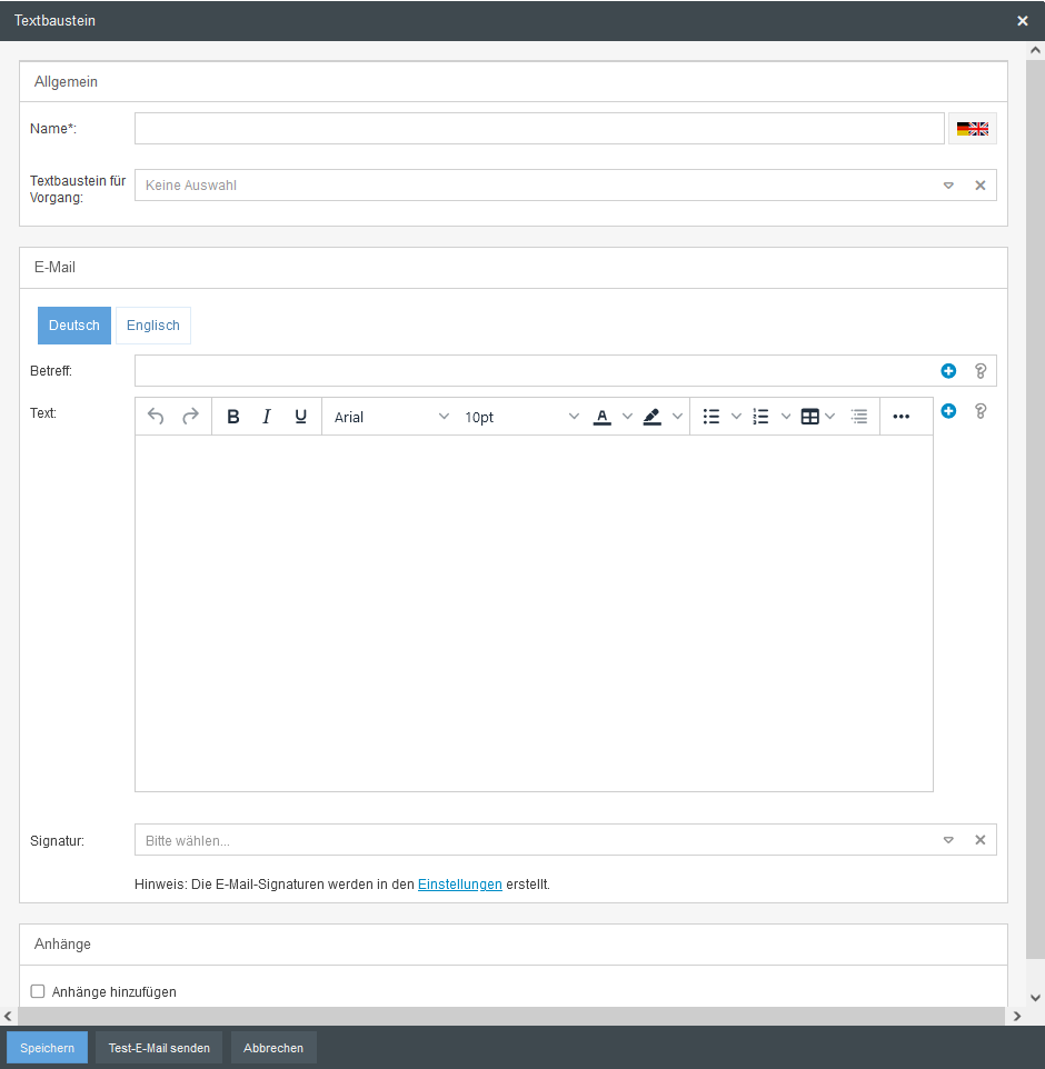 Wenn im Bereich Anhänge die Checkbox Anhänge hinzufügen aktiviert wird, können verschiedene Dateianhänge für den Textbaustein definiert werden. Diese werden in der E-Mail automatisch angefügt.