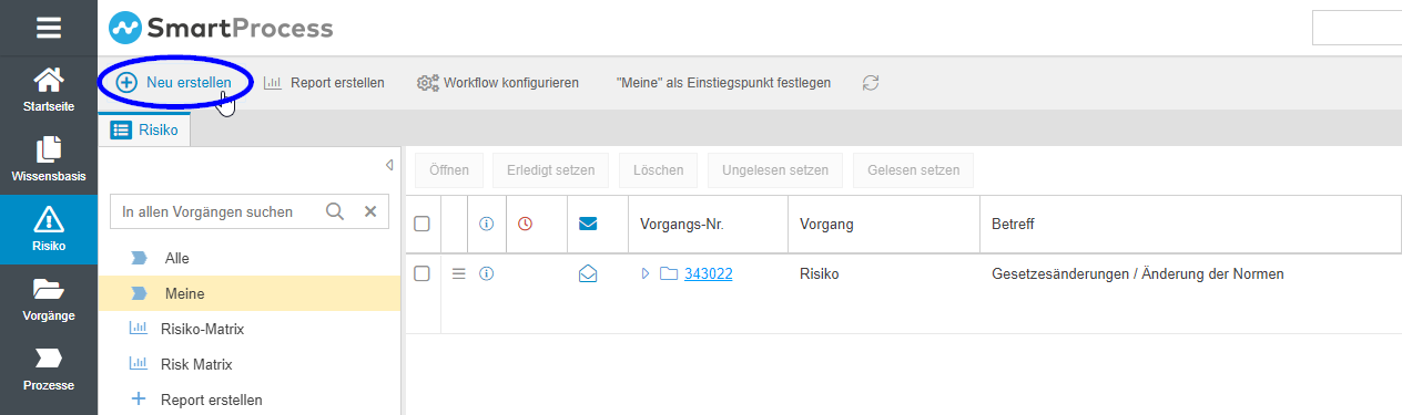 - Über das Menü Vorgänge -> Neu erstellen -> Risiko