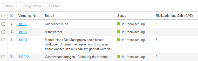 Mit der Standard-Anwendung Risiko können Sie Ihre Unternehmensrisiken zentral erfassen, in regelmäßigen Abständen überprüfen und bewerten sowie bei Bedarf Maßnahmen zur Risikobehandlung einleiten.