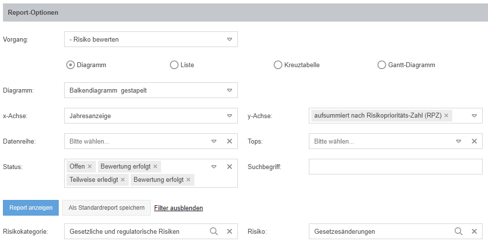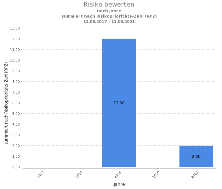 Folgende Reportkonfiguration stellt z. B. die RPZ pro Jahr von dem Risiko 'Gesetzesänderungen' grafisch dar.