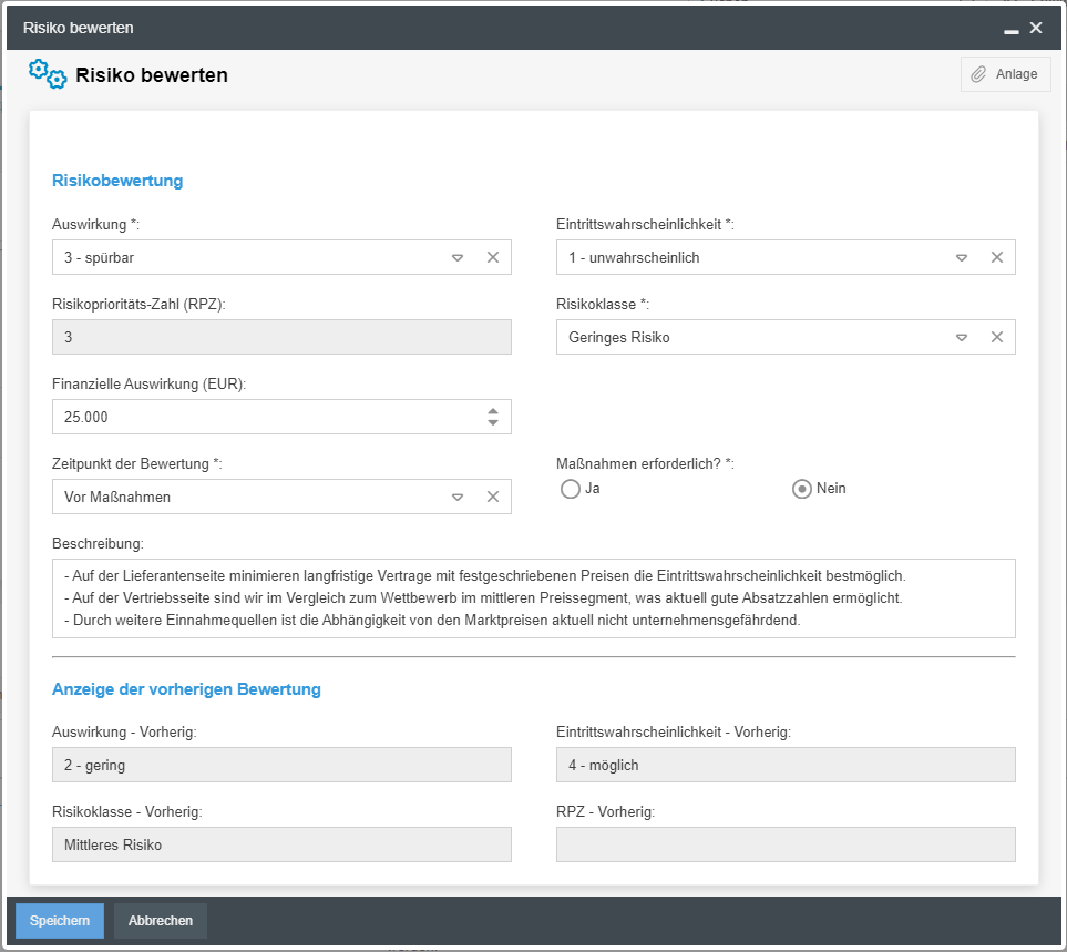 - Finanzielle Auswirkung (EUR) -> Wenn möglich oder notwendig kann hier der mögliche finanzielle Schaden bei Eintritt des Risikos erfasst werden.