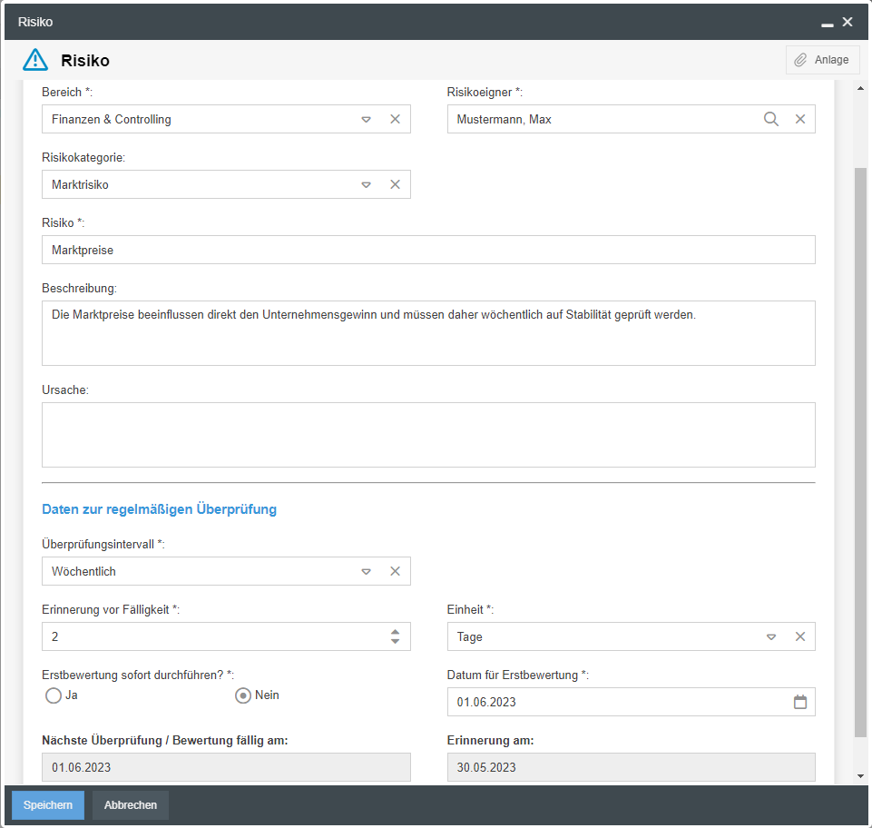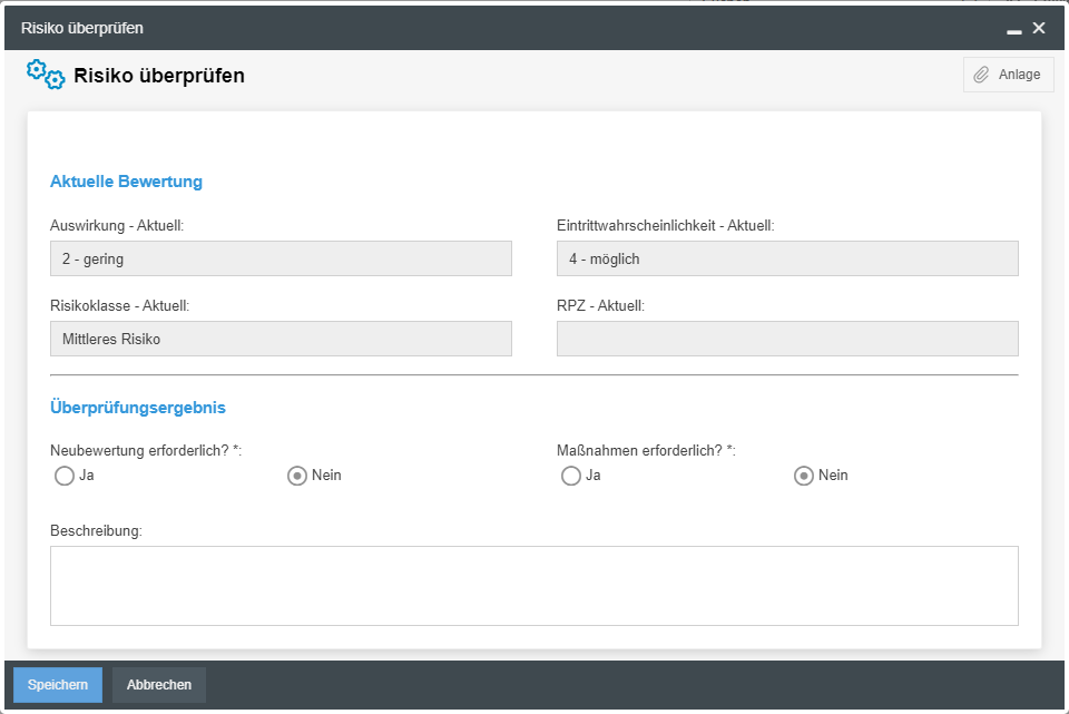 Wenn der Risikovorgang geöffnet wird, kann die Aufgabe 'Risiko überprüfen' mit folgenden Eingaben durchgeführt werden:
