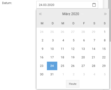Mit einem Feld vom Typ "Datum" kann ein Feld in einem Vorgang angezeigt werden, in dem ein Datum manuell oder aus einer Kalenderansicht eingetragen werden kann. Das genutzte Format orientiert sich an Vorgaben aus den Einstellungen zu Datum und Zeit.