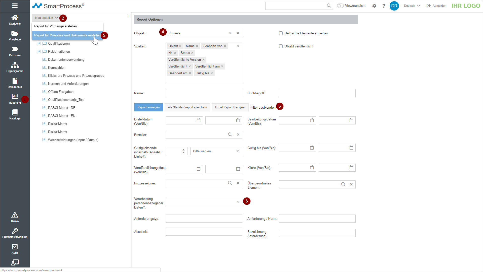 Sobald Sie ein benutzerdefiniertes Feld erstellt und sich erneut im System angemeldet haben, können Sie auch nach diesem Wert filtern. Gehen Sie hierfür in das Menü <Reporting> (1), wählen <Neu erstellen> (2) und <Report für Prozesse und Dokumente erstellen> (3).