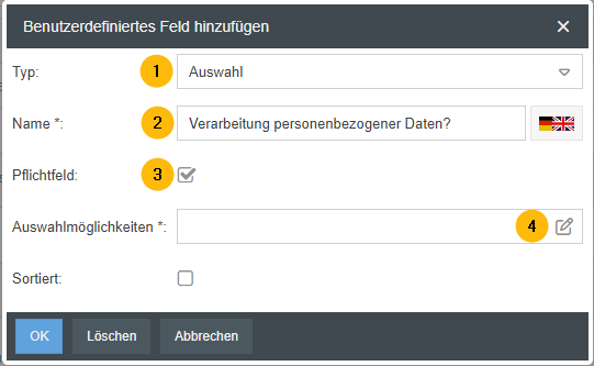 Wenn Sie ein (Mehrfach-)Auswahlfeld erstellen möchten, erscheint zusätzlich die Möglichkeit „Auswahlmöglichkeiten“ zu bestimmen und eine Checkbox, um diese Listeneinträge ggf. alphabetisch zu sortieren. Wenn Sie am rechten Rand dieses Felds auf den Bearbeiten-Stift klicken (4), können Sie Auswahloptionen für die Dropdown-Liste hinzufügen.