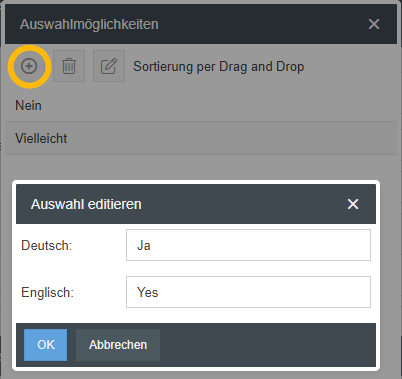 Für eine neue Auswahloption klicken Sie das Plus und vergeben einen Namen für die Auswahloption. In diesem Beispiel wird eine Option „Ja“ erstellt. Bestätigen Sie den Eintrag anschließend mit <OK>.