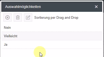 Mit dem <Mülleimer-Symbol> kann ein bereits erstellter Eintrag wieder gelöscht und mit dem <Stift-Symbol> ein bestehender Eintrag umbenannt werden. Vorhandene Einträge können per Drag and Drop auch individuell sortiert werden.