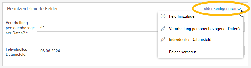 Sobald mindestens ein Feld angelegt wurde, ist der Bereich für Benutzerdefinierte Felder aufgeklappt. Über <Felder konfigurieren> können Sie die bestehenden Felder bearbeiten.