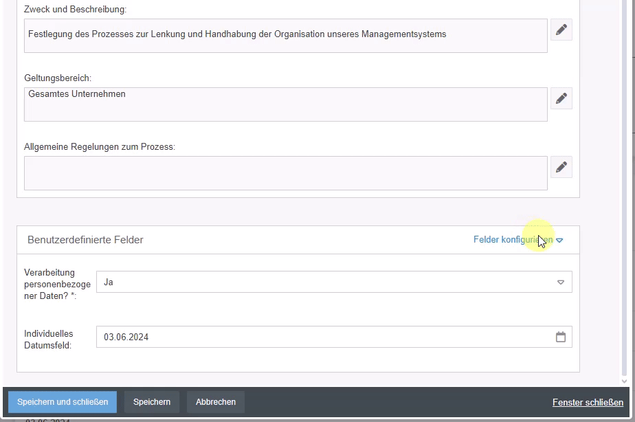 Sollten Sie zusätzlich zu den vorinstallierten Feldern in den Prozessdetails weitere Eigenschaften zu Ihren Prozessen erfassen wollen, können Sie sich hierfür beliebig viele benutzerdefinierte Felder…