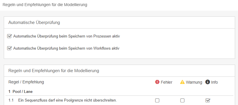 Mit den Regeln und Empfehlungen für die Prozessmodellierung können Sie in verschiedenen Bereichen Vorgaben für das Modellierungsteam einstellen. Diese kommen dann im Prozess-Designer zum tragen, wenn ein Prozess oder Workflow gespeichert wird oder wenn die Prüfung manuell ausgelöst wird. Sie basieren einerseits auf den allgemeinen Vorgaben aus der BPMN und andererseits auf Funktionsaspekten aus SmartProcess.