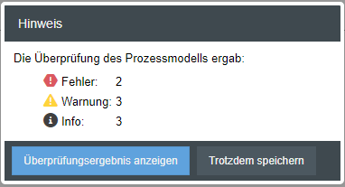 Hier kann festgelegt werden, ob die Prüfung zusätzlich zum manuellen Aufrufen auch automatisch beim Speichern von Prozess- und/oder Workflow-Modellen durchgeführt werden soll. Die Modellierenden können dann entscheiden, ob sie sich die Ergebnisse im Einzelnen anzeigen lassen und die Punkte beheben, oder ob sie sie ignorieren und das Modell speichern bzw. verlassen wollen.