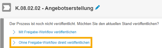 Direkte Veröffentlichung von Prozessen ohne den Freigabe-Workflow | Wenn diese Option aktiviert ist, dürfen die Benutzer Prozessgruppen und Prozesse veröffentlichen, ohne dass dies im Rahmen des Freigabe-Workflows von weiteren Personen als Prüfende oder Freigebende bestätigt werden muss. ![]() Wenn die Option deaktiviert ist, dürfen die Benutzer Prozessgruppen und Prozesse ausschließlich mit dem Freigabe-Workflow veröffentlichen. |