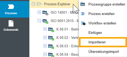 Prozesse exportieren und importieren | Wenn diese Option aktiviert ist, dürfen die Benutzer Prozessgruppen und Prozesse aus SmartProcess exportieren. ![]() Außerdem dürfen Benutzer diese Exporte in der gleichen oder anderen Installationen von SmartProcess über den Prozess-Explorer wieder importieren. ![]() |
