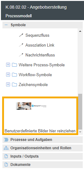 Benutzerdefinierte Bilder für alle Benutzer unter der Symbolpalette hinzufügen und löschen (Im Prozessdesigner) | Wenn diese Option aktiviert ist, dürfen die Benutzer im Prozessdesigner am unteren Ende des Reiters 'Symbole' Bilddateien hinzufügen und entfernen. Diese Bilddateien können anschließend von allen Benutzern bei der Prozessmodellierung verwendet werden. ![]() |