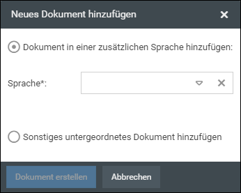 Wenn Sie Ihr Dokument in einer zusätzlichen Sprache hinzufügen möchten, wählen Sie die Sprache des neu zu erstellenden Dokuments aus. Das neue Dokument erhält in diesem Fall keine fortlaufende Dokumenten-Nr., sondern wird mit der gleichen Nummer des bestehenden Dokuments erstellt plus dem angehängten Sprachkürzel für die ausgewählte Sprache.