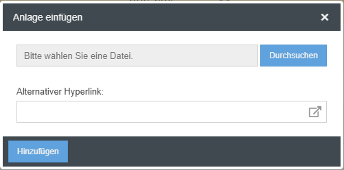 In dem sich öffnenden Fenster können Sie entscheiden, ob Sie per <Durchsuchen> eine Datei von Ihrem Laufwerk auswählen oder mit einem Hyperlink auf die Dateianlage in einem bereits bestehenden Dokumentenmanagementsystem verweisen.